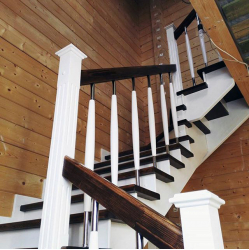 Pakāpieni un roku balsts - tumši beicēts osis. Vaigi, pretpakāpieni un reliņi - baltā krāsā krāsota priede.