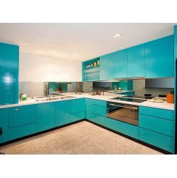 Zilas krāsotas virtuves skapīšu durvis.